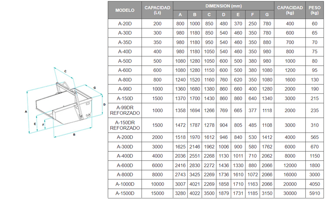 Balde autodescargante para concreto, modelo A99D