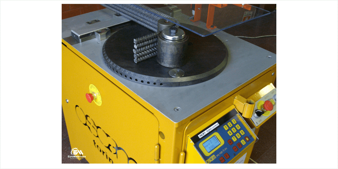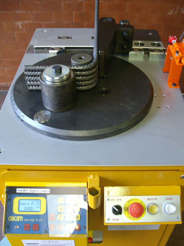 Máquina construida en versión derecha e izquierda. Está equipada con un grupo reductor de nueva concepción y permite una alta producción. Está preparada tanto para el doblado normal como para doblado de radio grande. La serie completa de pernos, casquillos y rodillos suministrada de serie, permite efectuar todos los doblados y ángulos deseados, así como todo tipo de estribos. Los pernos centrales son de conexión rápida. La máquina está equipada con pedal para mando a distancia.